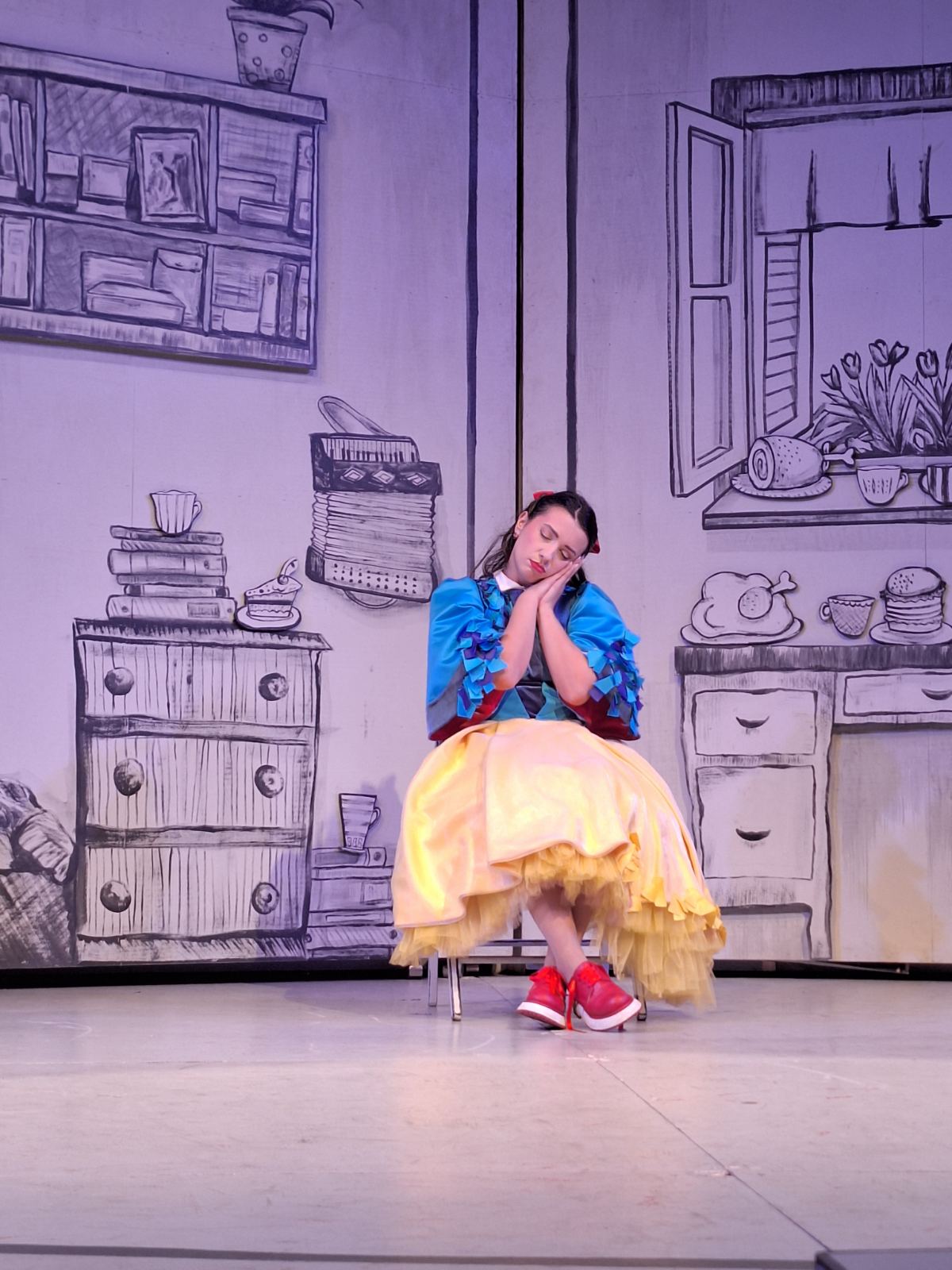Уз клавирску пратњу Наталије Мијаиловић, под диригентском управом Ивана Ђачића, наступиће Милица Страхинић (Снежана), Анђела Симић (Краљица), Маша Савић (Огледало), Дамјан Мишић (Принц), Илија Марков (Ловац/ Огледало, глас), као и Данијела Поповић, Исидора Богдановић, Вера Зечевић, Катарина Катанић,Теодора Илић, Милица Жижић и Андреја Калезић у улогама патуљака.