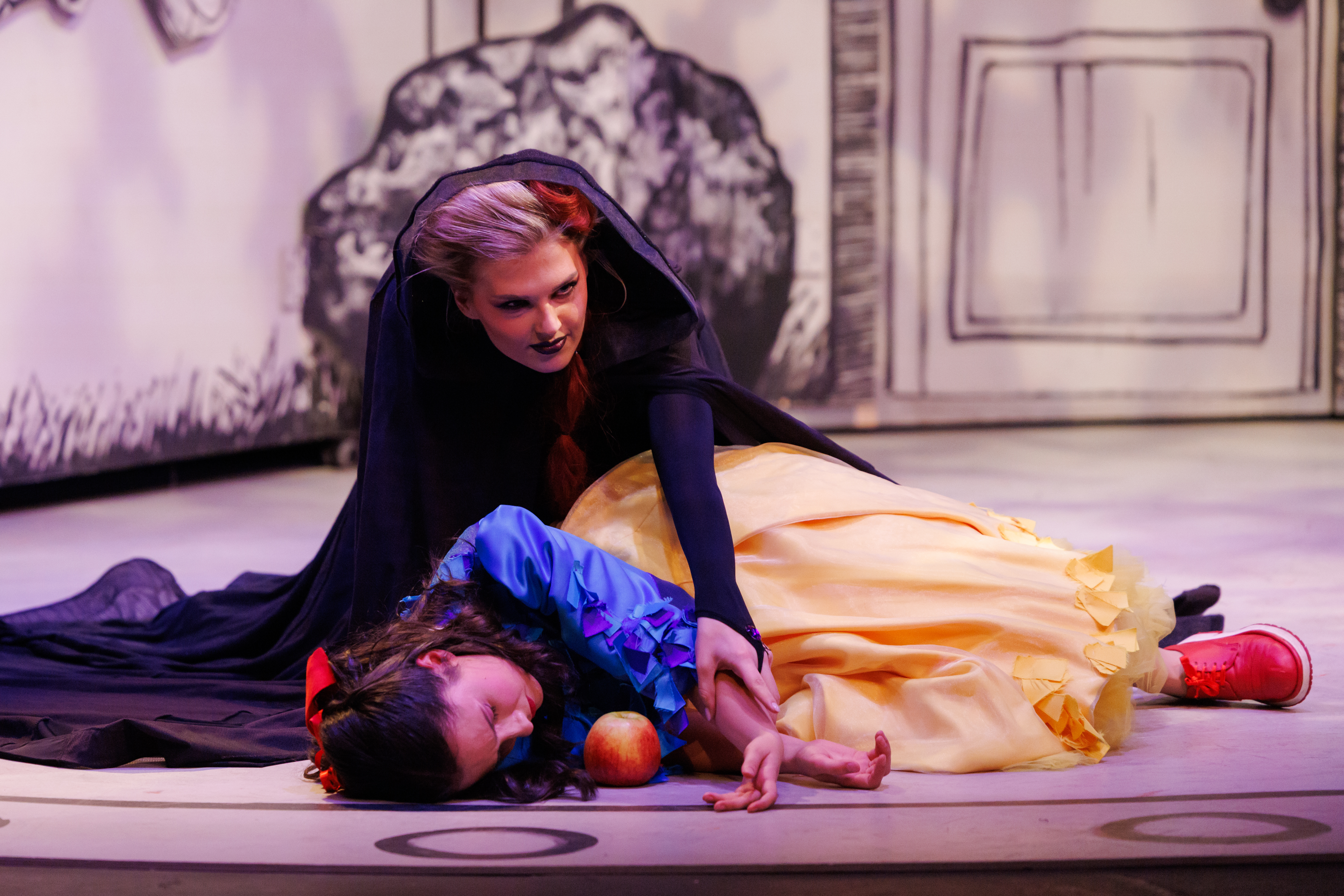 Тематски оквир интерпретације заснива се на идеји немогућности очувања спољашње лепоте. Краљица, опседнута сопственим изгледом, комуницира са својим одразом у огледалу које на њу врши притисак да мора бити најлепша. Њен сукоб са пасторком Снежаном настаје јер је она лепша, али и млађа од ње. Краљица није у стању да се помири са својим годинама и лепотом коју, упркос великом труду, не може да очува.