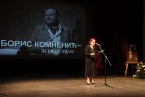 Потресним речима, од њега се прва опростила управница Ивана Вујић Kоминац која је истакла да је данас диван, сунчан дан, баш онакав какав и треба да буде, када на пут креће „млад, леп, плав, необичан, изузетан, веома поштен, искрен, никад задовољан, господин глумац, Борис Kомненић”.
